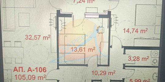 It consists of an entrance hall with a toilet, a large living room with a kitchen and dining room /33 sq.m/, two separate bedrooms /14 and 15 sq.m/, with a common hall, bathroom with a toilet, a separate toilet and a wet room, a balcony, which is accessed from the three rooms - the two bedrooms and the living room. Southeast exposure.