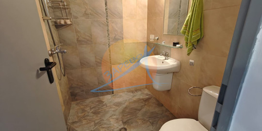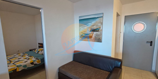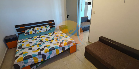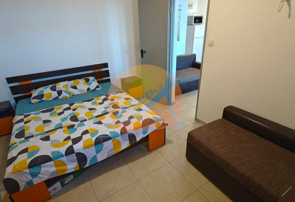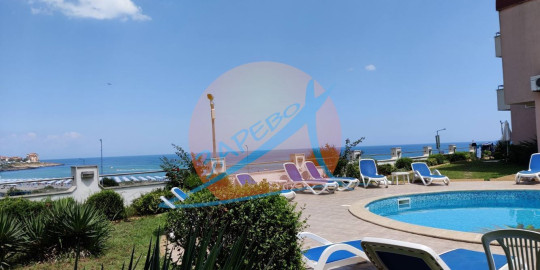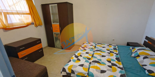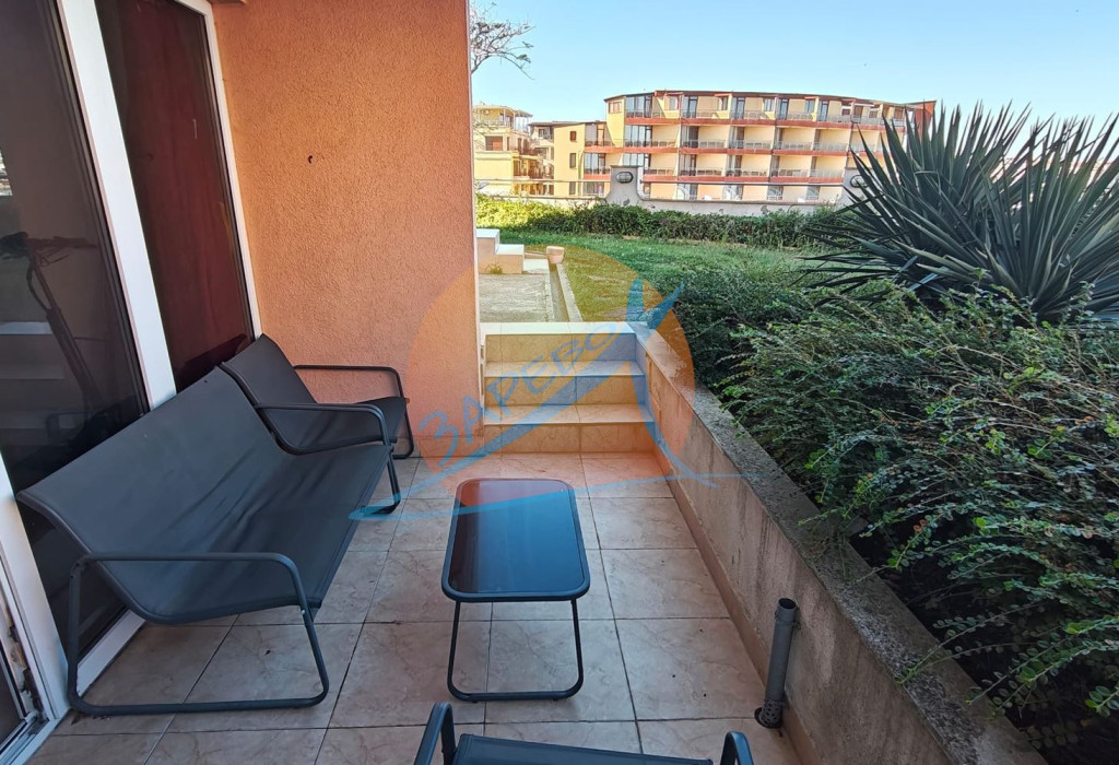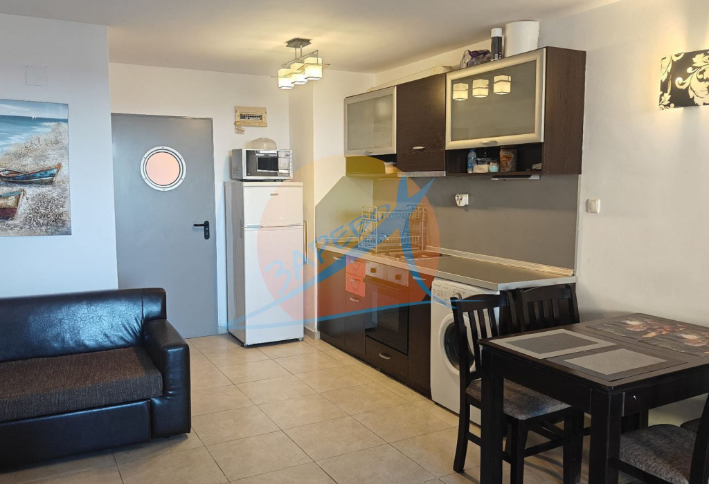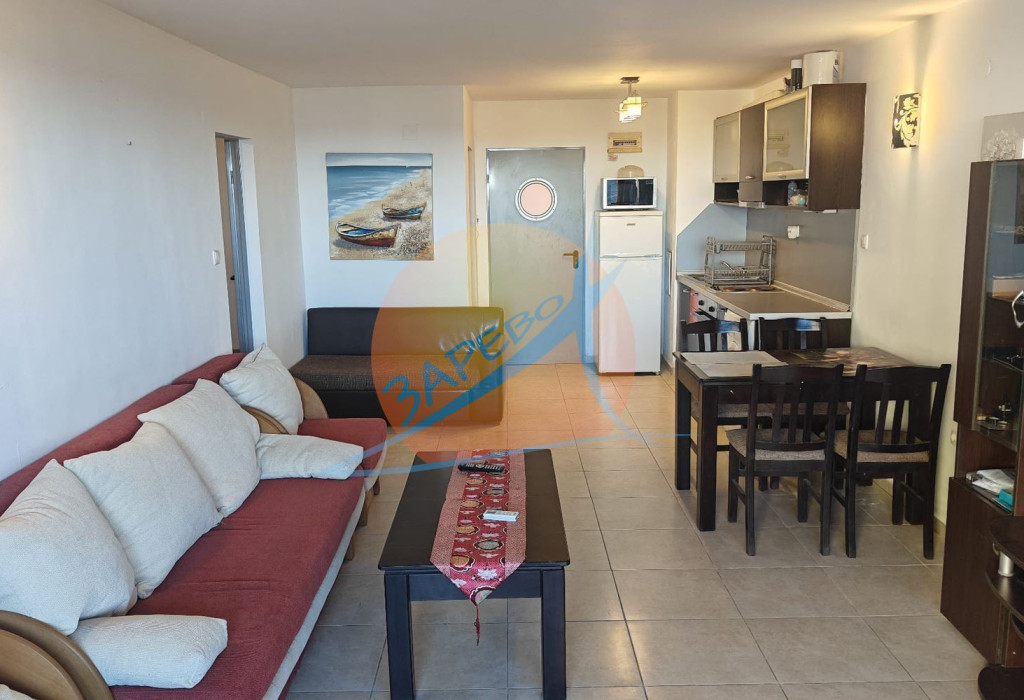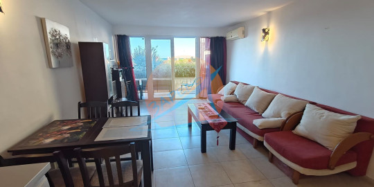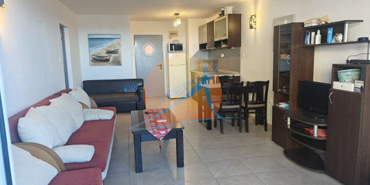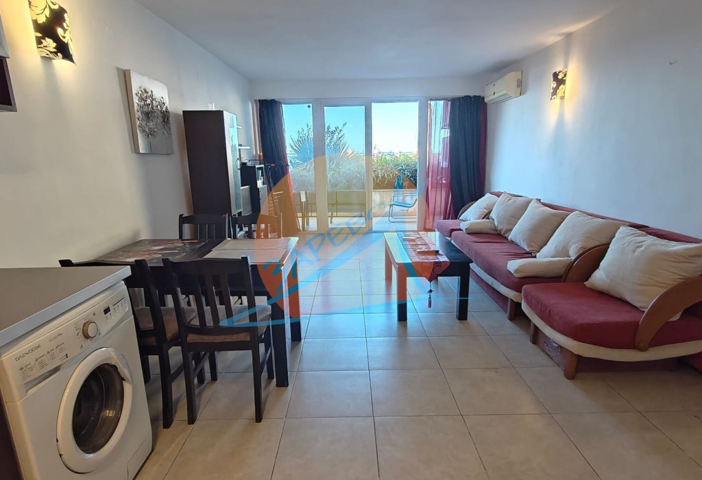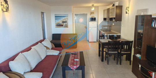 Двустаен обзаведен апартамент - 64 кв.м, разположен в жилищна сграда с ниска такса поддръжка и малък басейн. Продава се с паркомясто и земя - 40 кв.м. Общата площ на недвижимия имот е 104 кв.м.