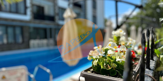приморско, намештен студио са погледом на базену, зелени рај В (Греен Парадисе В), АЦТ 16 - Пета фаза године -роглав зелени рајски комплекс, Приморско. Састоји се од улазне дворане, дневног боравка са простором за спавање, купатилом са ВЦ-ом и балконом. Нуди се на продају модерно намјештен и опремљен, спреман за употребу.