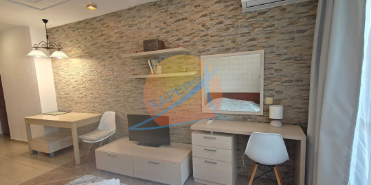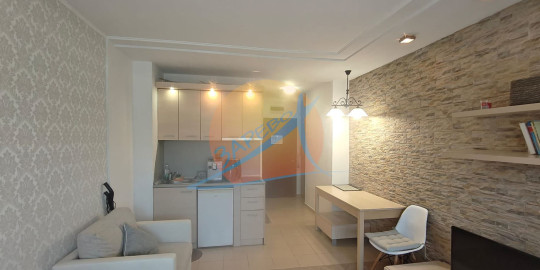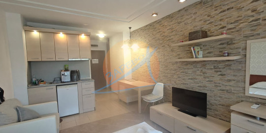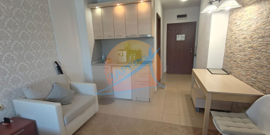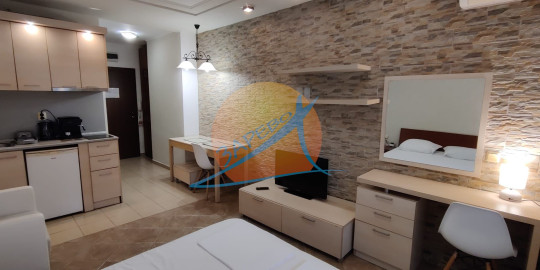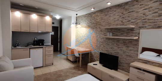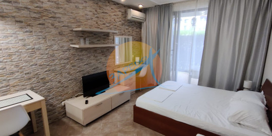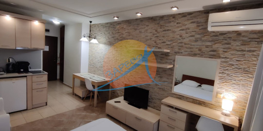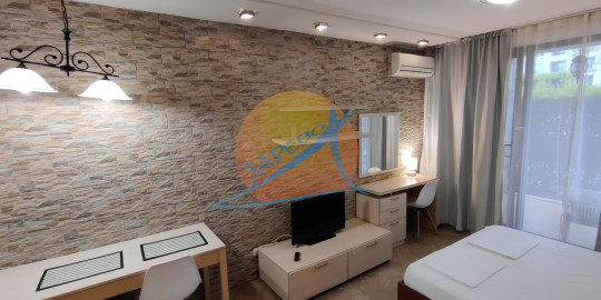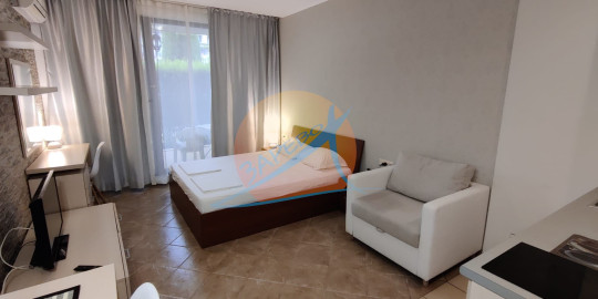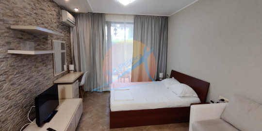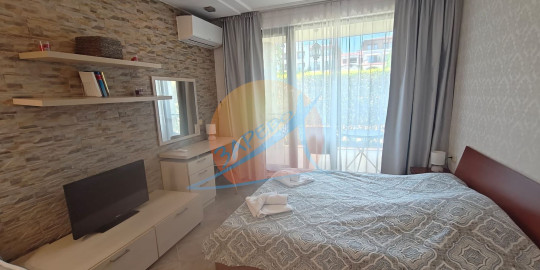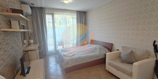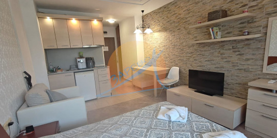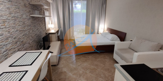 Студиото е светло и просторно, с обща площ от 42 кв.м., на партер, с голяма веранда и полянка, с изложение запад. Живият плет и зеленината осигуряват уединение на външното пространство. Разпределението е функционално, осигурява необходимия уют и комфорт. Състои се от антре, просторно помещение с дневна и спална зона с климатик, обособен кухненски бокс, баня с тоалетна и балкон. Студиото е обзаведено и оборудвано. Кухненският бокс е оборудван с котлони, аспиратор, хладилник, посуда. Възможност за настаняване на 2 възрастни + 1 дете в разтегателен фотьол или бебе в кошара.