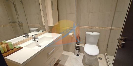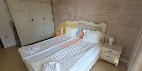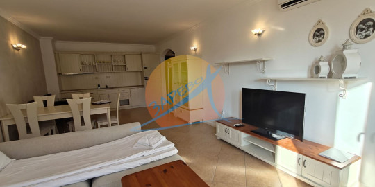 Апартаментът е разположен в секция Б, на 3-ти етаж, с обща площ 92 кв.м. Състои се от просторна дневна с кухня, трапезария и хол, отделна спалня, баня с тоалетна и тераса с гледка градина и малко море. Продава се стилно обзаведен и оборудван, напълно готов за ползване.