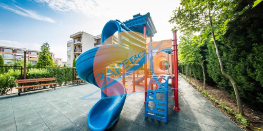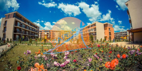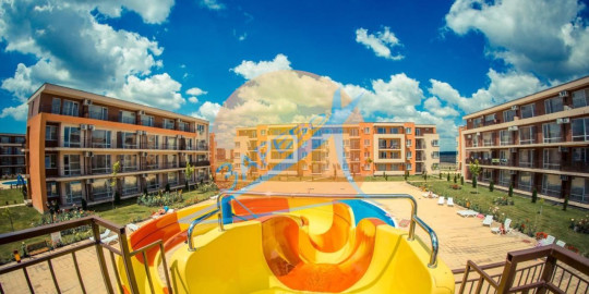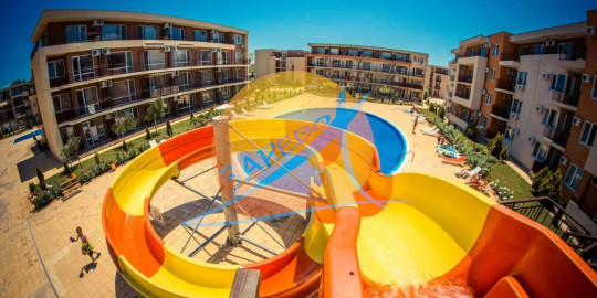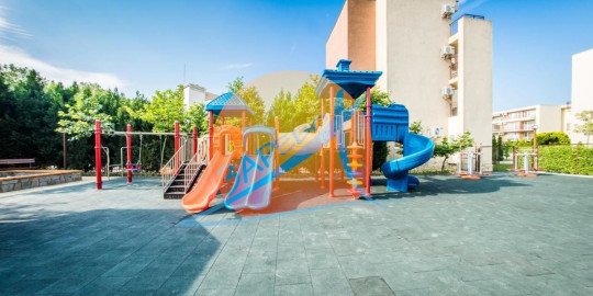 Намира се до аквапарка и на около 10 мин пеша до плажа. Има богато озеленена територия с няколко външни басейна, зона за тренировки на открито, детски площадки.