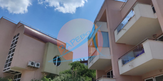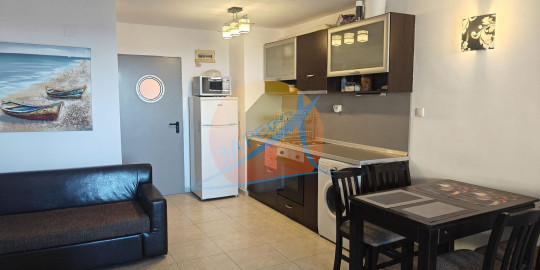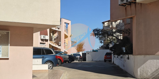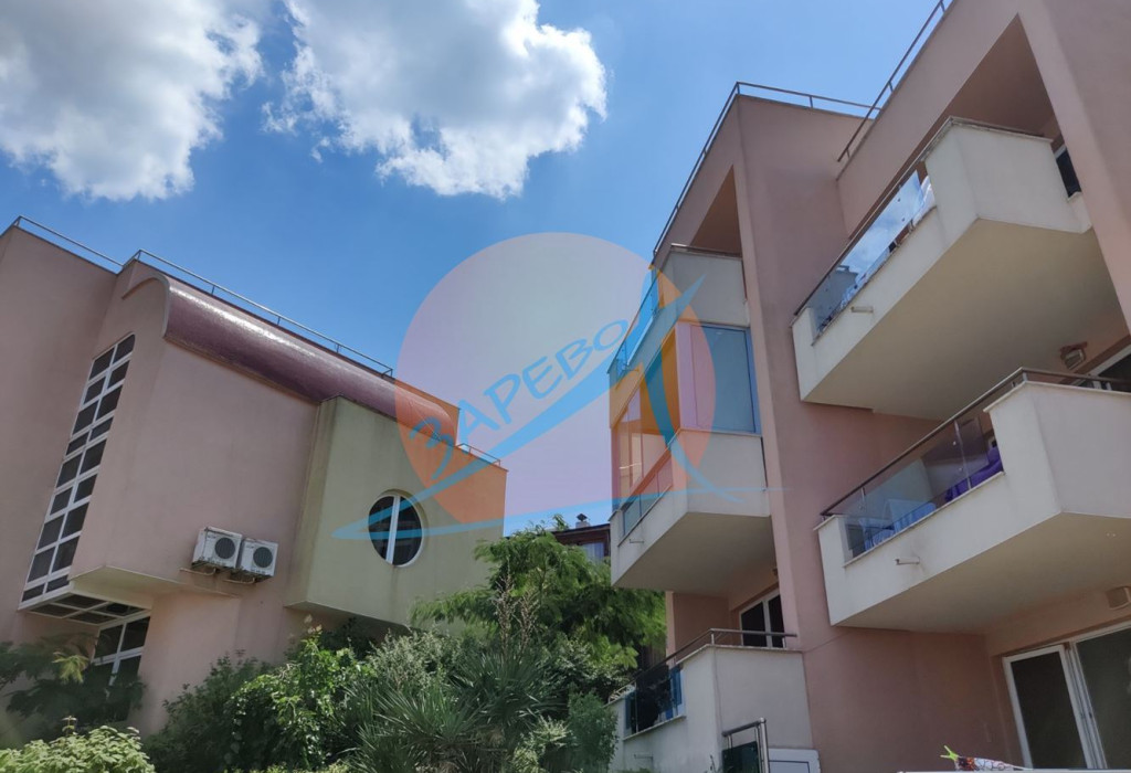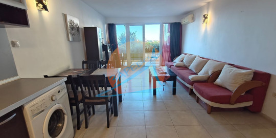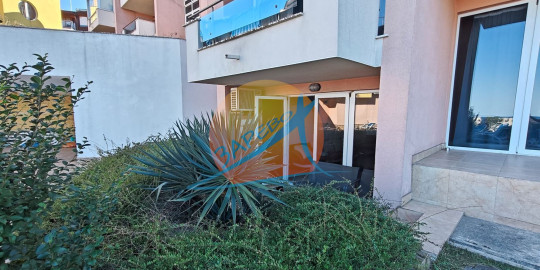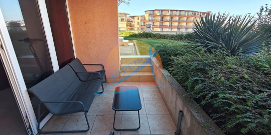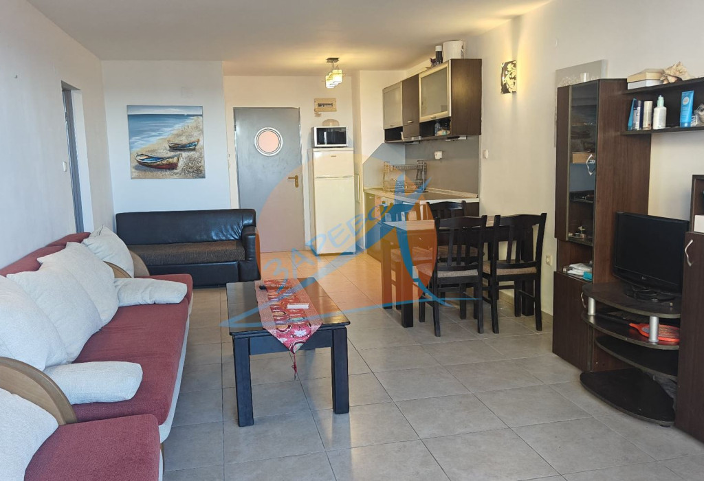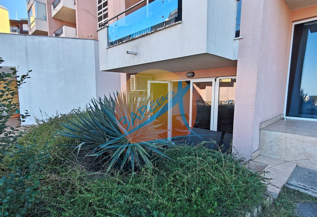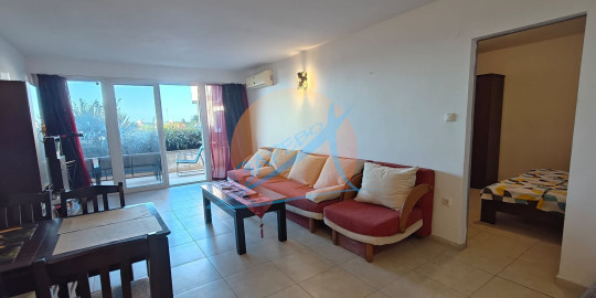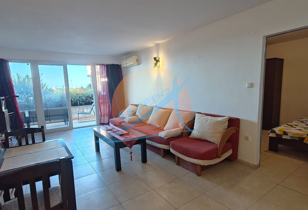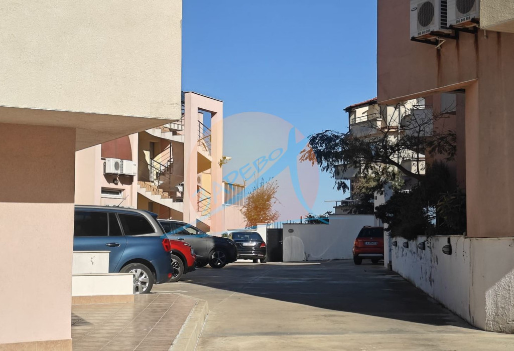 Двустаен обзаведен апартамент - 64 кв.м, разположен в жилищна сграда с ниска такса поддръжка и малък басейн. Продава се с паркомясто и земя - 40 кв.м. Общата площ на недвижимия имот е 104 кв.м.
